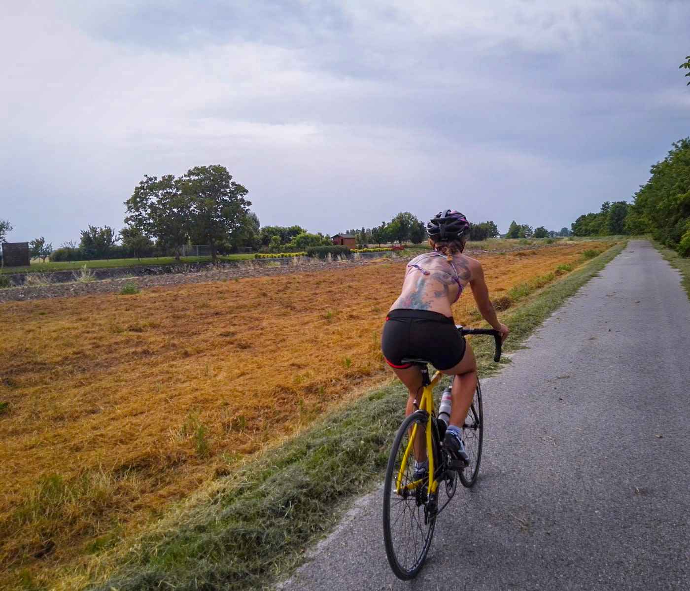 Partiamo quindi dalla stazione dei treni di Rovigo, dove inizia una pista ciclabile che costeggia l’Adigetto per parecchi chilometri, passando per Roverdicré e arrivando vicino a Costa di Rovigo. Il panorama è quello tipico polesano: corsi d’acqua, piante d’argine, vegetazione incontrollata, campagna. La pista ciclabile è davvero bella e curata, lungo il percorso si trovano anche delle panchine dove riposare e a volte vi capiterà di incrociare lungo il cammino qualche famiglia di nutrie, le vere regine dei canali polesani. Niente paura: se le lasciate stare, loro lasceranno stare voi.
