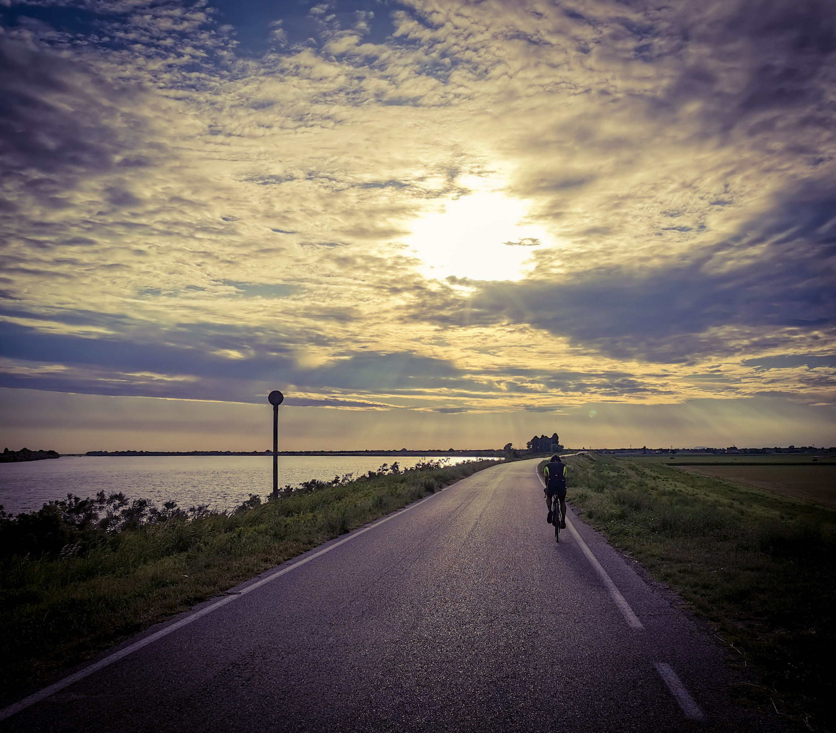 Dopo aver attraversato le splendide valli di Porto Levante (ecomuseo del Delta del Po – LEGGI QUI), ammirato lo splendido paesaggio ed ecosistema di valle Bagliona, abbandonate la strada e imboccate lo sterrato a sinistra che vi condurrà in cima all’argine che costeggia il ramo del Po di Maistra. Se avete una mtb o una gravel qui potete optare anche per fare tutto il giro di Valle Scanarello, un vero spettacolo per i sensi immerso nella natura più selvaggia. Colori, profumi, silenzi alternati a cinguettii vi rapiranno e vi porteranno in un’atmosfera surreale.