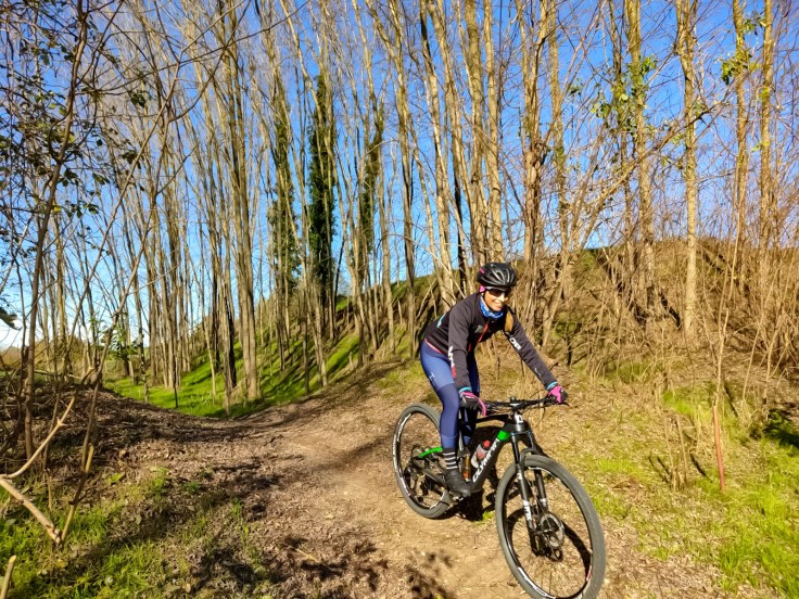Inizia da Concadirame, proprio dalla strada che conduce in cima allo sterrato dell’argine. Qui si scende sull’erba e si inizia a percorrere un sentiero che vi condurrà tra dunette, saliscendi, curve, salti sulla terra. E non solo: non si tratta del classico panorama arginale, piatto e senza vegetazione se non canneti. Ci sono tantissimi alberi. E il sentiero passa proprio tra gli alberi: per qualche chilometro vi sembrerà di essere in montagna, circondati da una folta vegetazione, tronchi, rampe naturali, avvallamenti, addirittura stagni. Devo ammettere che molte discese devo ancora imparare ad affrontarle perché troppo ripide 🙂 E’ un ottimo allenamento.