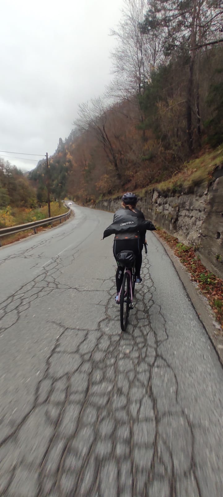 Unica nota stonata: il tempo ha piovuto tutto il giorno. E così ho scoperto cosa serve per farsi trovare pronti alla grande pioggia: tutto, tutto, tutto idrorepellente. Purtroppo invece io avevo solo un antipioggia come giacca, mi mancavano pantaloni e copri scarpe e ne ho pagato le conseguenze in termini di temperatura e umidità (mi sono cambiata tre volte durante la giornata per evitare l’ipotermia). Ma ho scoperto un trucco meraviglioso per la mia testa: nelle giornate di pioggia portate con voi una cuffia di silicone della piscina e mettetela attorno al casco… Vi salverà la vita!