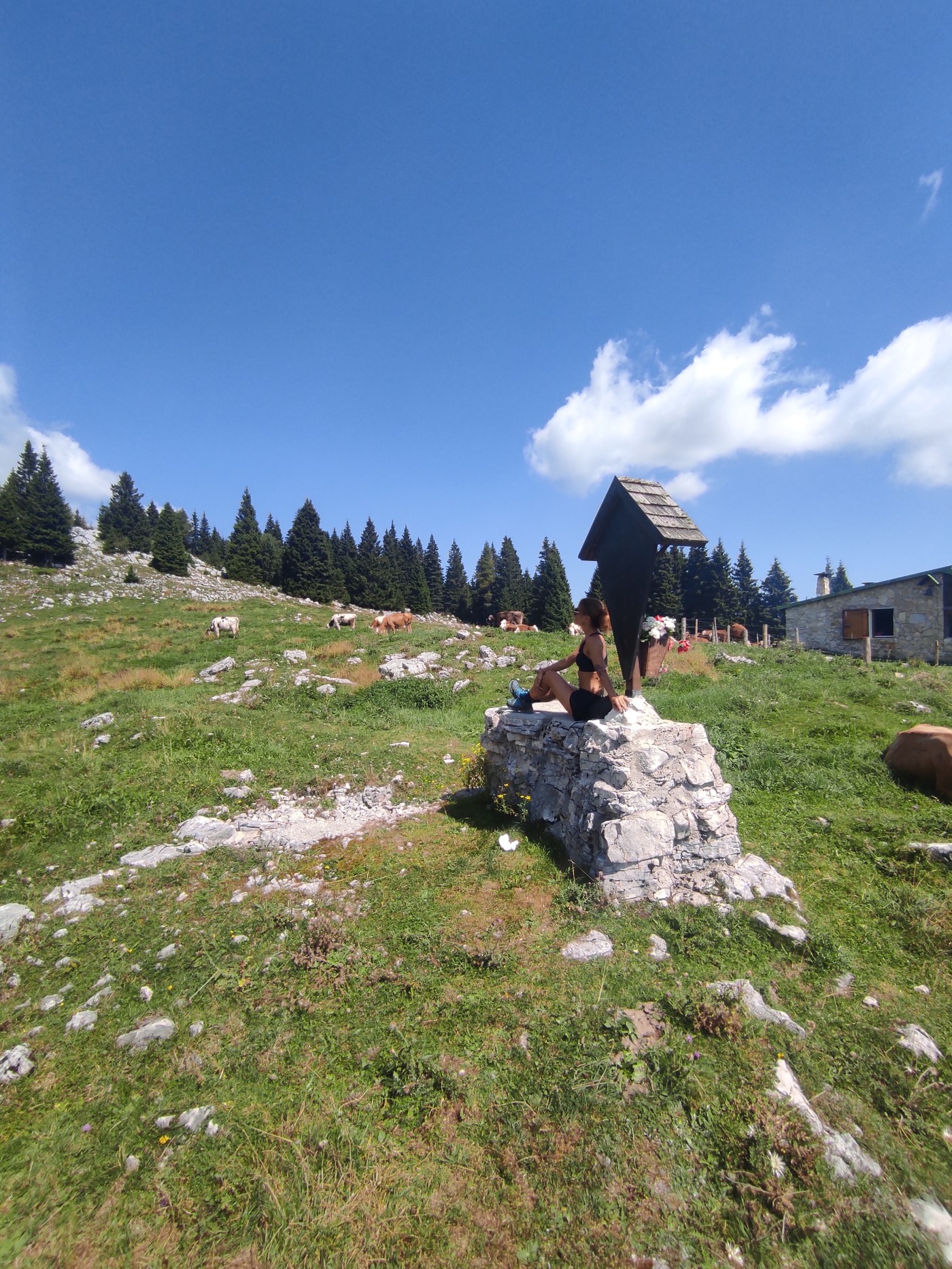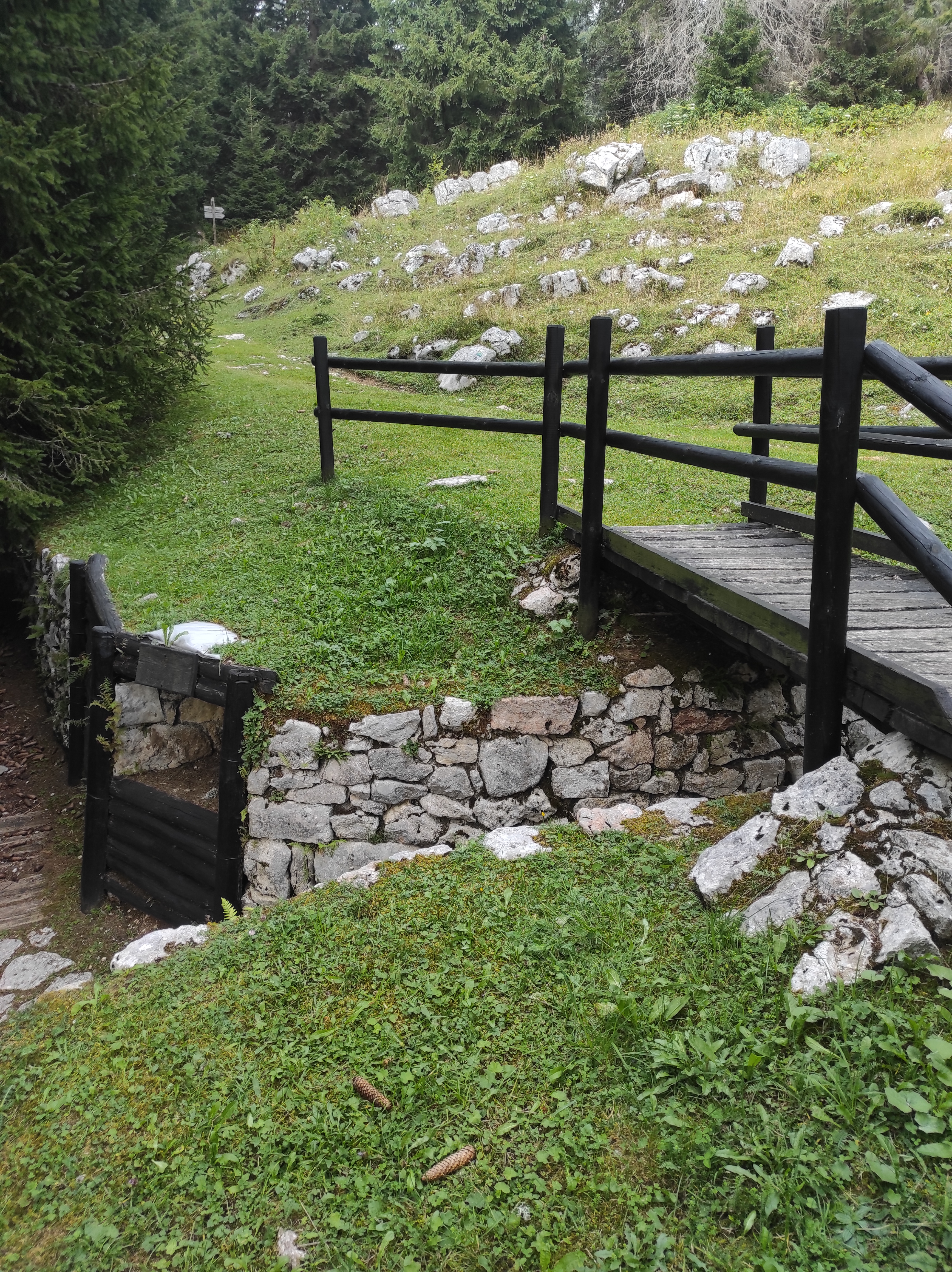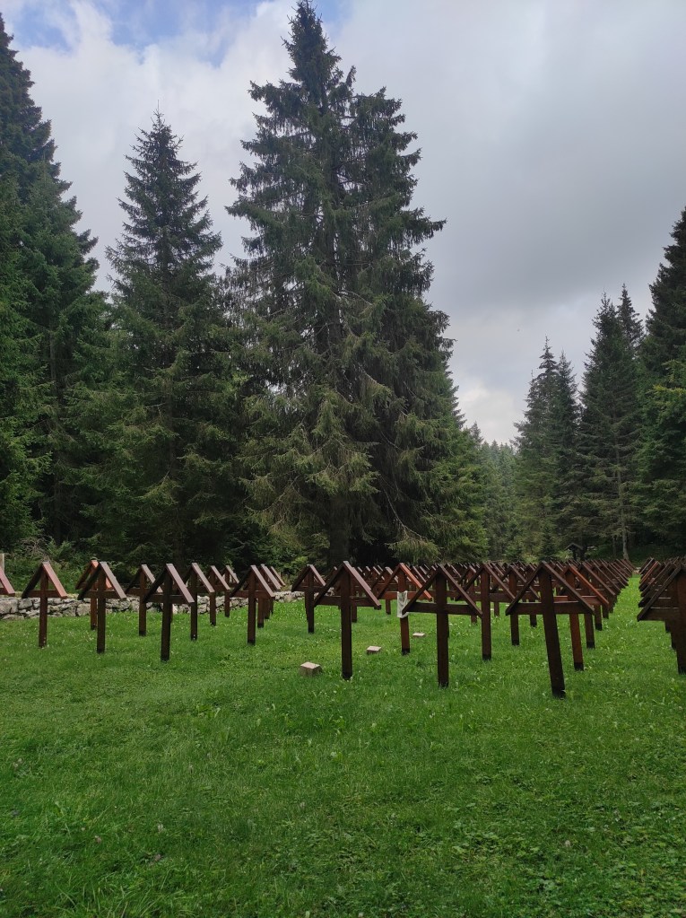 Una volta mangiato (perché saranno passate circa 2 ore e mezza dalla partenza) raggiungete dalla malga la cima del monte Zebio per ammirare il panorama e i resti delle trincee italiane e austriache, sparse ovunque. E da qui, poi, tutta discesa! La strada è sconnessa e rocciosa, ma almeno non si fatica. Tenete sempre la vostra destra e raggiungete il suggestivo cimitero di legno della Brigata Sassari (in cui sono sepolti oltre 200 soldati sardi) e la ricostruzione storica delle trincee che proprio qui erano state allestite durante la Grande Guerra. Un’emozione unica, che vi parla della storia dell’altipiano e d’Italia intera, del sangue dei migliaia di morti caduti in guerra per difendere il confine e della crudeltà umana. Anche qui è presente un bivacco, ma non è aperto al pubblico se non su prenotazione.