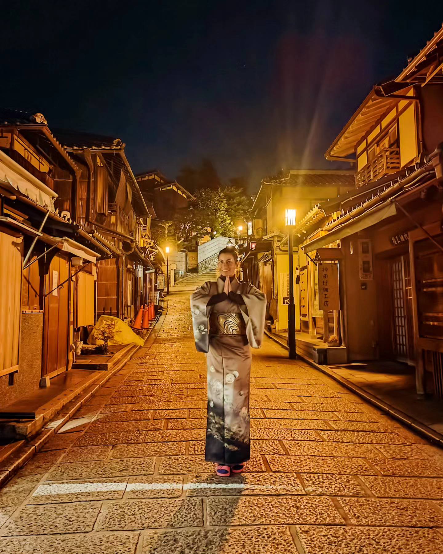 Sono arrivata a Kyoto dopo aver percorso la Nakasendo road e il suo fascino mi ha subito conquistato: sono stata accolta da centinaia di persone in kimono intente a visitare i templi principali della città, giovani in abiti tradizionali con trucchi variopinti che mettevano in scena spettacoli teatrali e danze coreografiche, corsi d’acqua e strade romantiche, mercati alimentari da fare invidia ai migliori ristoranti. Kyoto ha una sua anima e te la presenta subito, ed è molto diversa da Tokyo. Qui è tutto più lento, elegante, minimale, storico. Una città più turistica, sicuramente, ma che trasuda di storia e di un’attenta estetica. E mi sono subito adattata, comprando io stessa un kimono usato: si possono trovare tantissimi negozi vicino al templio centrale di Gion, il santuario di Yasaka.