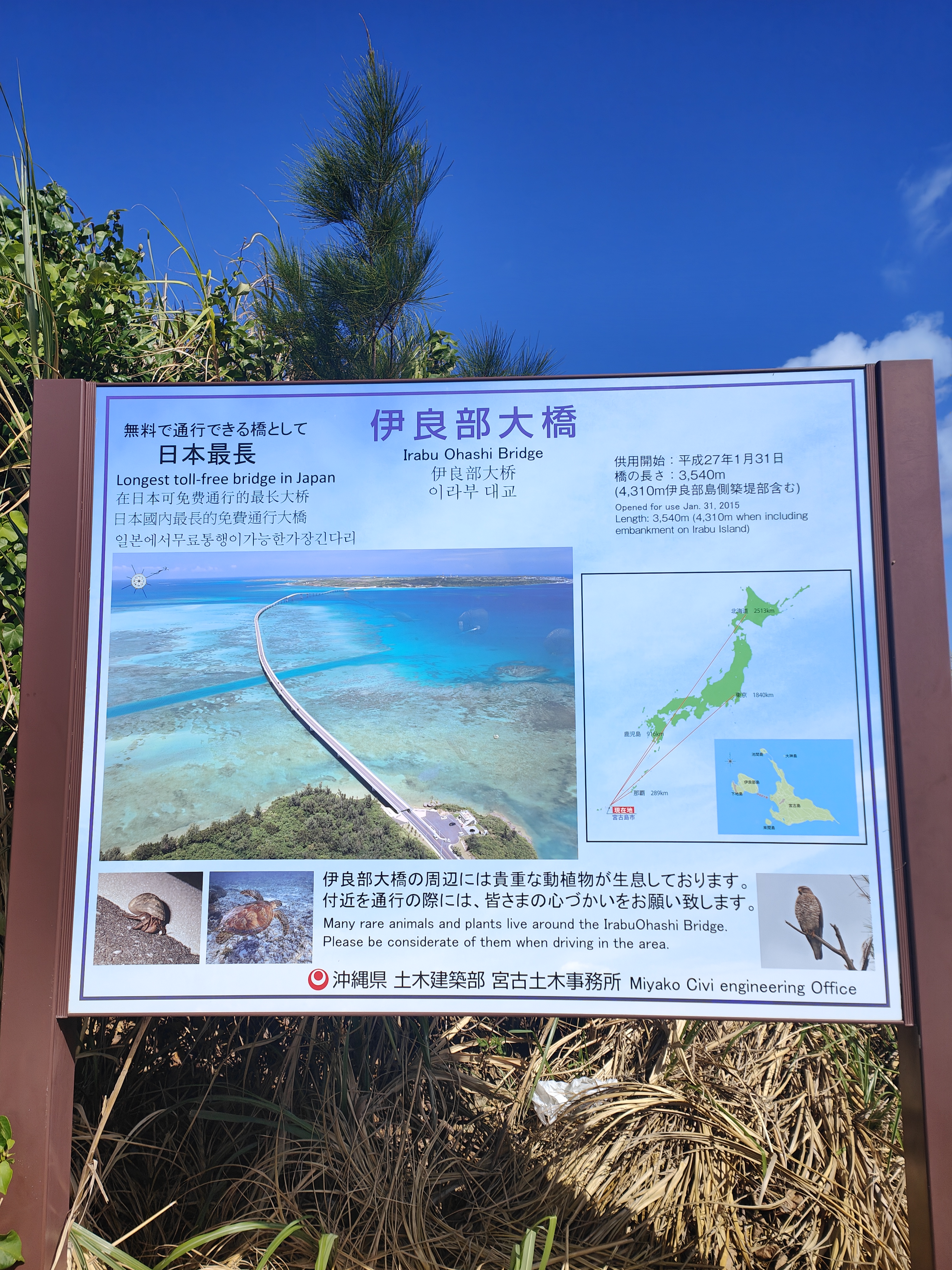 L’isola di Miyakojima in realtà non è un’isola, ma un arcipelago di piccole isole collegate tra loro tra suggestivi ponti sospesi nell’acqua turchese, tutta percorribile in bici: la distanza più lunga da un punto all’altro è di 35 km. E’ un territorio assolutamente selvaggio e poco turistico: le strutture sorgono solo su di un lato dell’isola (sud ovest), tra il campo da golf e il German village. Il resto è un susseguirsi di case di local convertiti in b&b circondati da una folta vegetazione tropicale. Ricordatevelo anche per la sera: nel resto dell’isola i ristoranti sono veramente pochi e per chi gira in bici come me è necessaria una luce perché non esistono lampioni di notte. Ma tranquilli: come tutto il Giappone Miyakojima è super sicura e anche si vi trovate completamente soli a mezzanotte non vi succederà assolutamente nulla. Anzi, potete ammirare come mai vi è successo le stelle in cielo in mezzo all’oceano, senza luci che vi daranno fastidio. Il panorama spazia da spiagge paradisiache a campi coltivati al centro dell’isola, con l’eccezione dei lunghi ponti che collegano le isole e il faro di Cape Higashi Hennazaki. Miyakojima è una delle poche isole, inoltre, senza serpenti.