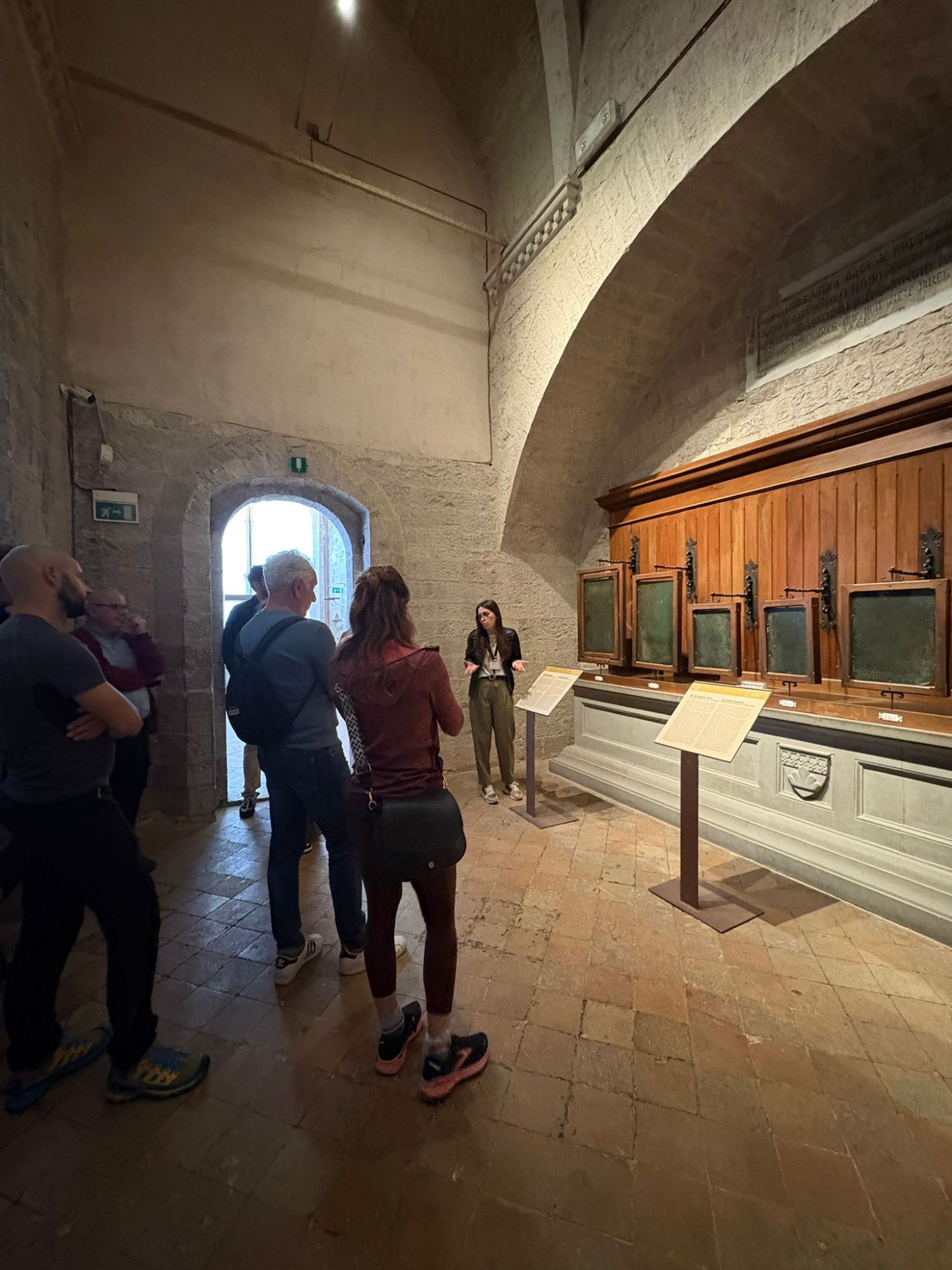 Molto prima dei Romani, Gubbio era una città umbra, popolazione contemporanea a quella etrusca, da cui era separata dal Tevere. La testimonianza più preziosa di quel passato sono le Tavole Iguvine, custodite nel Palazzo dei Consoli, in pieno centro. Si tratta di sette lastre in bronzo scritte in lingua umbra tra il III e il I secolo a.C., una vera miniera di informazioni su riti religiosi, leggi e cerimonie pubbliche. Sono considerate tra i documenti linguistici più importanti del mondo antico. Leggerle è come affacciarsi su un mondo scomparso, fatto di dèi misteriosi e comunità organizzate con precisione sorprendente.
