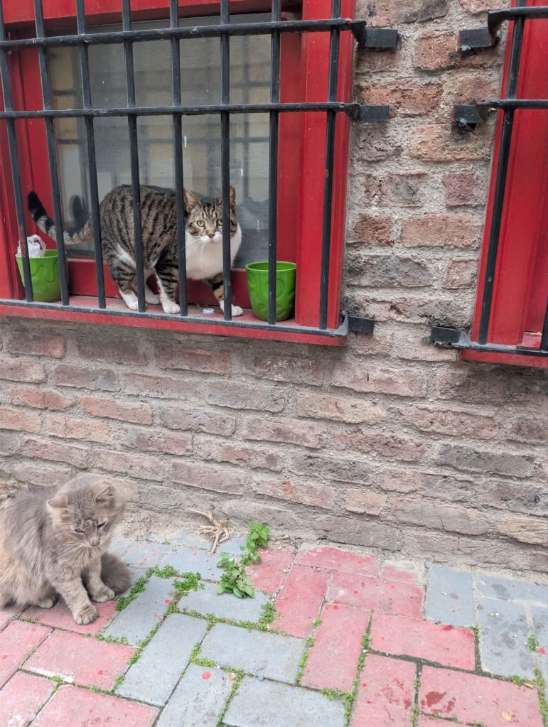 E poi ci sono loro: i veri padroni della città. I gatti. Istanbul è probabilmente una delle città più feline del mondo. Vivono liberi ovunque: nei mercati, nei negozi, nei bar, nei cortili delle moschee, davanti alle librerie e persino dentro i ristoranti. Non sono randagi nel senso classico del termine: sono gatti di comunità. I cittadini li nutrono, li accudiscono, li proteggono. In molte strade si trovano distributori automatici di crocchette e piccole casette costruite apposta per loro.